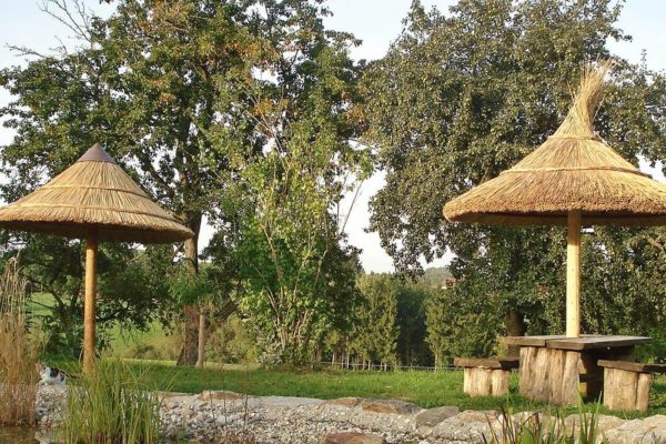 Unsere zur Gänze in Österreich gefertigten Sonnenschirme bestehen aus einer Holz-Eisen-Konstruktion, auf welches das Schilf aufgebracht wird. Da das Material sehr witterungsbeständig ist, kann dieser ganzjährig im Freien stehen.